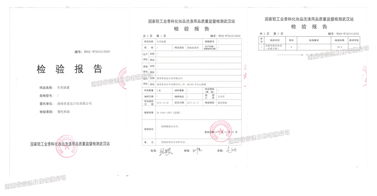 2016年12月,由富達日化自主研發(fā)的車用尿素到國家輕工業(yè)香料化妝品洗滌用品質(zhì)量監(jiān)督檢測武漢站檢測,根據(jù)GB2440-2001《車用尿素》等檢測依據(jù),送檢的產(chǎn)品符合標準要求。