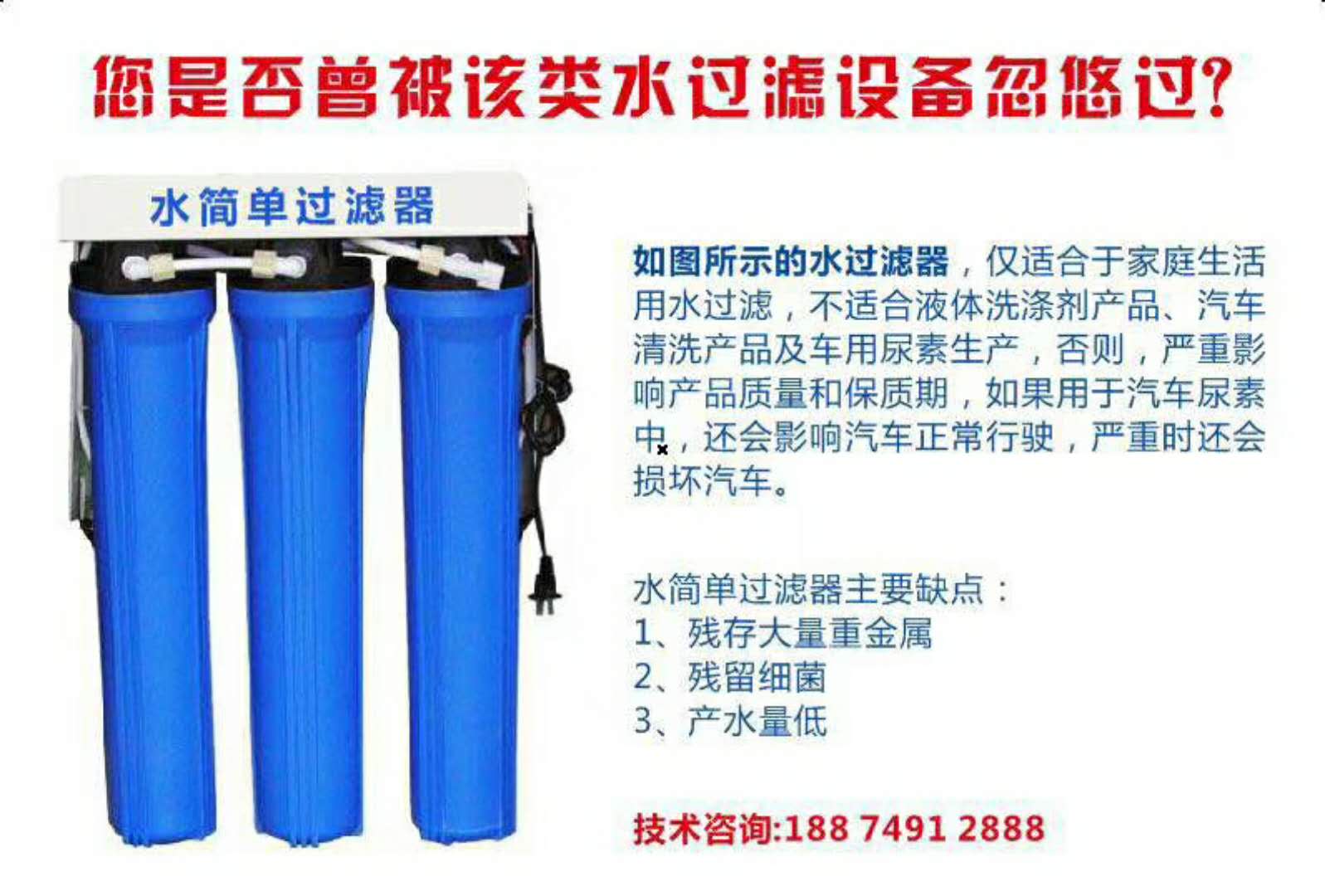 如圖中水處理只能對水進行簡單過濾,如果購機者發現車用尿素設備銷售商采用這種單個或連續三個并排鏈接的藍色過濾器,一是出水產量低,二是過濾器容易堵塞,三是無法去除水中的重金屬和細菌,只能用于家庭用水的簡單過濾,不能用來處理生產車用尿素的水,淘寶價格僅90元每個。