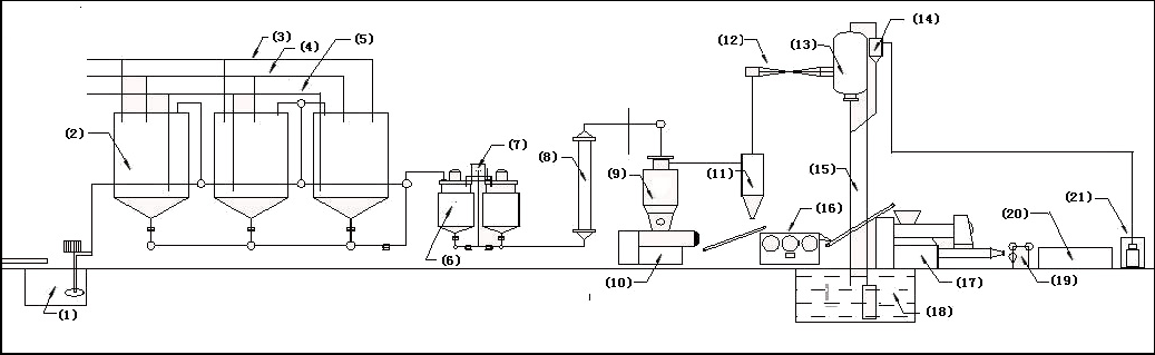 (1)溶堿罐;(2)油脂皂化鍋;(3)燒堿管閥;(4)水管管閥;(5)蒸汽管閥;(6)配料調和罐;(7)泡花堿罐;(8)列管加熱器;(9)真空干燥室;(10)真空造粒機;(11)旋風分離器;(12)高壓噴射泵;(13)大氣冷凝器;(14)汽水分離器;(15)輸送帶;(16)三輥研磨機;(17)上下真空出條機;(18)循環潛水泵;(19)切塊輥印機;(20)成品輸送帶;(21)真空泵。