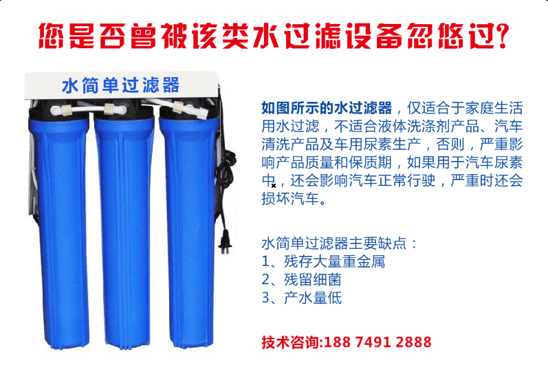 多項專利發明人王先軍 手機:150-7483-5702 手機:195-7316-0288水處理品種繁多,有如圖所示的簡單過濾式,也有正規反滲透水處理設備,前者只能過濾水中的常規雜質,后者可以去除水中的重金屬離子,還可以殺滅水中的大腸桿菌、芽孢菌。綠農桿菌等細菌,從而提高產品去污力,延長產品保質期,前者簡單水過濾設備只適合散裝大桶洗滌劑生產,后者水處理形成的去離子水可以生產保質期長的瓶裝洗滌產品。
